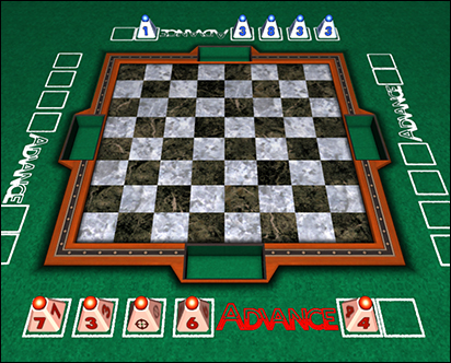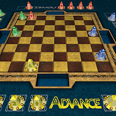 Advance is a turn based game that is best described as a cross between Chinese checkers and the card game War with special pieces added to enhance the game play.